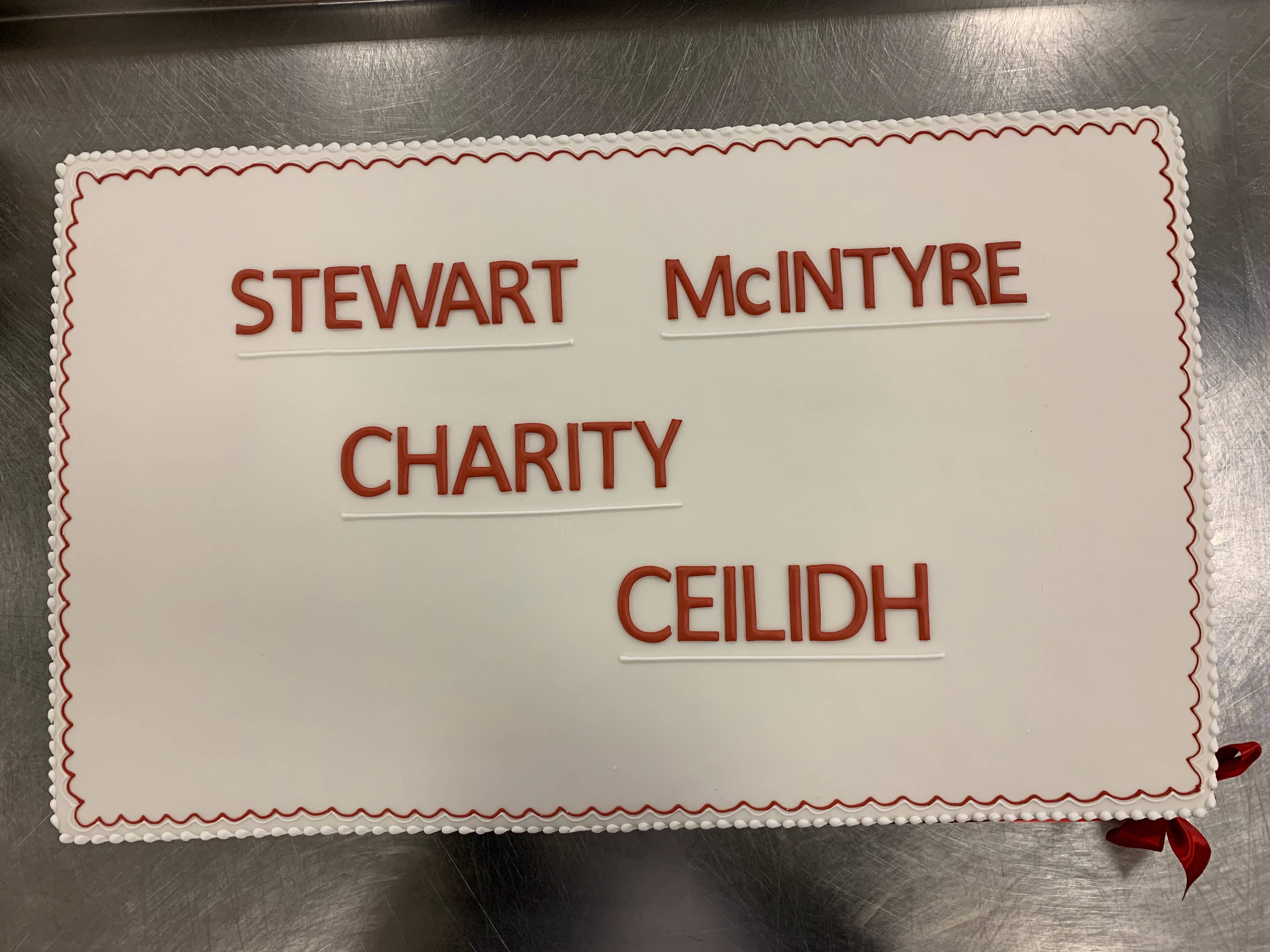 We created a giant slab cake for 275 people to enjoy who attended the recent 'Stewart McIntyre Charity Ceilidh'. We’re in a fortunate position to be able to bake something big enough to serve 200+ people. Harry Gow were so pleased to be able to support such a worthy cause and donate a cake that could be enjoyed by guests and also celebrate someone who was much-loved and lost too young